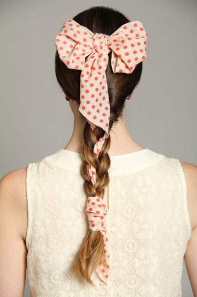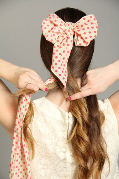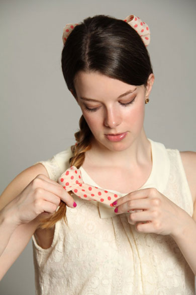1. ผูกผ้าพันคอให้เป็นโบว์ ให้หางของโบว์มีความสั้นข้างหนึ่งยาวข้างหนึ่ง แล้วติดเข้ากับผมด้วยกิ๊บ ในบริเวณที่เราจะเริ่มถักเป็นเปีย