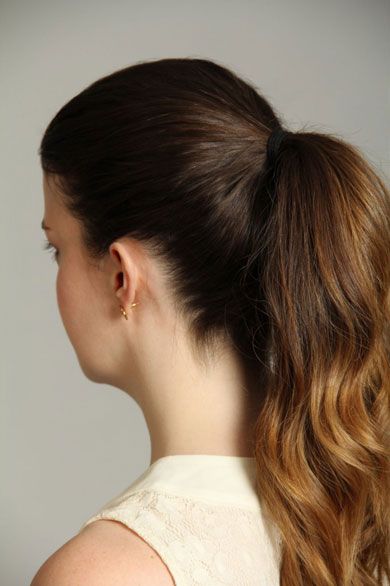 1. รวบผมเป็นหางม้า และมัดไว้ด้วยยางยืด หางม้าจะสูงระดับใดก็ได้ ขึ้นอยู่กับว่าคุณต้องการบันที่มีความสูงมากน้อยแค่ไหนค่ะ