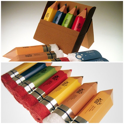 ผ้าเช็ดตัวที่ถูกบรรจุในแพคเกจรูปดินสอมีหลายสีด้วยกัน