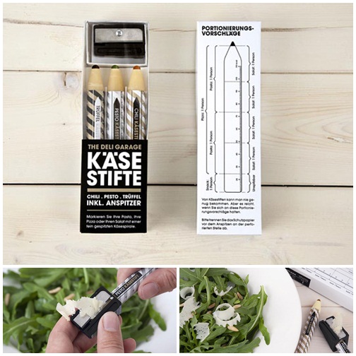 สำหรับคนที่ชอบทานชีสและต้องการความสะดวก ต้องดินสอแท่งนี้ที่ด้านในบรรจุพาร์เมซานชีสเอาไว้ เมื่อจะใช้เพียงใช้กบเหลาดินสอเหลาชีสออกมาเท่านั้นเอง
