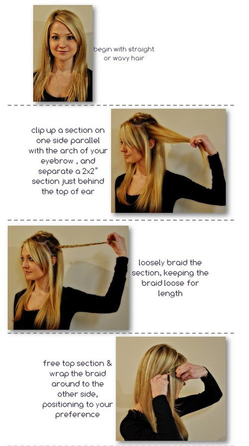 แบ่งผมส่วนแรกที่ขนานกับโหนกคิ้วด้านหนึ่งของเราแล้วติดกิ๊บไว้ก่อน จากนั้นแบ่งผมส่วนที่สองจากด้านบนของหลังหู เพื่อจะถักเปีย ถักเปียไม่ต้องแน่นมากจนสุดความยาวผม แล้วคาดมาที่ผมอีกฝั่งหนึ่ง ตำแหน่งของเปียขึ้นอยู่กับความพึงพอใจของเรา ใช้กิ๊บ1-2ตัวเพื่อยึดเปียไว้ที่ด้านหลังหู นำหวีค่อยๆหวีผมส่วนบนให้ฟูเพื่อสร้างวอลลุ่มให้ผม