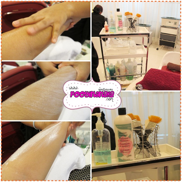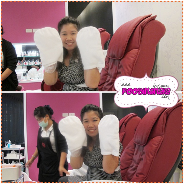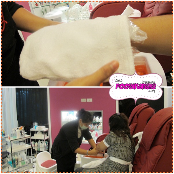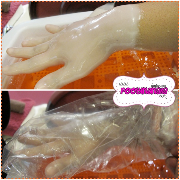 มาถึงขั้นตอนสำคัญค่ะ การทำพาราฟิน ตอนแรกก่อนจะเอามือจุ่มพนักงานจะใช้แปรงปัดใส่มือเราก่อนนะคะ เพื่อให้ร่างกายปรับ แต่นกไม่ร้อนมือเลยจุ่มเลยค่ะ จุมแล้วเอาขึ้น จุ่มแล้วเอาขึ้น ประมาณ 4 รอบค่ะ