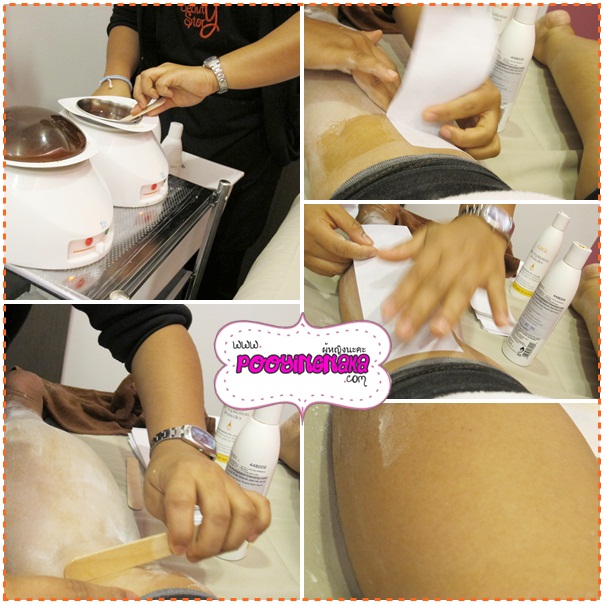 ที่นี่เค้าจะบริการเป็นห้องๆนะคะ ไม่เหมือนกับการที่เราไปแว๊กซ์ตามตลาดนัด ที่นั่งแว๊กซ์กันต่อหน้าประชาชนเยอะแยะ เริ่มแรกเลยก็เป็นการทำความสะอาดผิวเอาโลชั่นต่างๆออกก่อน เดี๋ยวขนจะไม่หลุด แว๊กซ์ไม่ติดค่ะ ผลิตภัณฑ์ที่นี่ใช้ยี่ห้อ GiGi เป็นของอเมริกาค่ะ จากนั้นก็จะเอาแป้งทา ซึ่งช่วยให้เห็นรุขุมขนชัดขึ้น จริงๆก็จะช่วยเรื่องดูดซับน้ำมันทำให้แว๊กซ์เกาะติดขนได้ดีขึ้นค่ะ