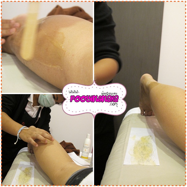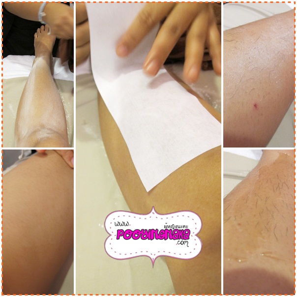 ที่นี่ใช้แว๊กซ์ร้อน เพราะจะช่วยให้รูขุมขนเปิดและขนจะไม่คุดนะคะ ใช้ไม้พายตักแว๊กซ์มาแล้วปาดลงบนผิวบางๆค่ะ แว๊กซ์จะอุ่นๆไม่ถึงขั้นร้อน จากนั้นก็ใช้ผ้าหรือเป็นกระดาษสำหรับแว๊กซ์แปะลงบนแว๊กซ์แล้วดึงออก ที่นี่ไม่ดึงแบบกระชากนะคะ ขนก็จะหลุดออกมาค่ะ