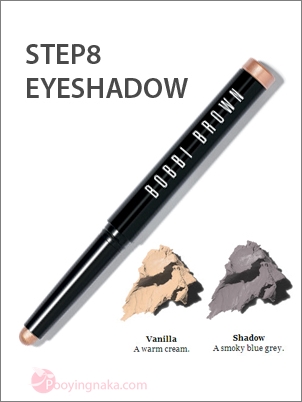 STEP 8 EYESHADOW ถึงคราวนางเอกของเราแล้ว Long-Wear Cream Shadow Stick สีที่เราใช้วันนี้มีสองสี คือสีครีมอ่อน Vanilla และสีเทา Shadow ขั้นแรกให้ลงสีอ่อนทั่วเปลือกตา โดยการทาเหมือนเขียนดินสอ แล้วใช้นิ้วเกลี่ยให้ทั่วบริเวณ จากนั้นตามด้วยสีเทา เขียนจนถึงรอยพับตา(คนตาหลบในให้เหนือรอยพับตาขึ้นมาหน่อยค่ะ) เกลี่ยให้สม่ำเสมอ และเขียนขอบตาล่างด้วยสีเดียวกันค่ะ