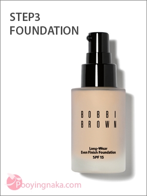 STEP 3 Foundation มาถึงขั้นตอนที่สำคัญ การลงรองพื้นเป็นอะไรที่ไม่ยาก แต่การจะเลือกให้สีกลมกลืนไปกับผิวจริงมากที่สุดนั้นไม่ง่ายเลย เทคนิคคือ เลือกรองพื้นมาสามสีที่ใกล้เคียงผิวเราก่อนค่ะ จากนั้นลองเกลี่ยเลือกสีที่กลืนไปกับผิวเรามากที่สุด จะช่วยให้การลงรองพื้นดูเป็นธรรมชาติ และหน้าไม่เทา สีที่ิใช้ในวันนี้ คือ Beige
