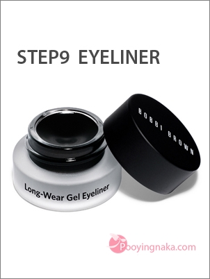 จากนั้นตามด้วย STEP 9 EYELINER โดยเขียนให้ชิดเส้นขนตามากที่สุด เขียนบริเวณวอเตอร์ไลน์ทั้งบนและล่างด้วยนะคะ เราอาจจะใช้ eyeshadow สีเข้ม(คล้ายสี Shadow) ลงทับบริเวณรอบตา ให้ดู Smokey ฟุ้งๆค่ะ