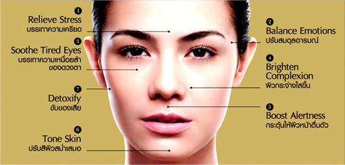 เมื่อนวดพร้อมกดจุดสำคัญต่างๆ บนใบหน้า ด้วยนิ้วชี้หรือนิ้วกลางประมาณท่าละ 5 วินาที แล้วปล่อยเพื่อผ่อนคลายโดยกดจุดบริเวณหน้าผากระหว่างคิ้วเพื่อช่วยบรรเทาเรื่องความเครียด บริเวณขมับทั้ง 2 ข้างเพื่อปรับสมดุลด้านอารมณ์ บริเวณเหนือโหนกแก้ม แต่อยู่ระหว่างใต้ตา เพื่อบรรเทาความเหนื่อยล้าของดวงตา บริเวณร่องปีกจมูกทั้ง 2 ข้าง เพื่อผิวกระจ่างใส บริเวณร่องเหนือริมฝีปาก ช่วยกระตุ้นให้ผิวหน้าตื่นตัว บริเวณคาง เพื่อปรับสีผิวสม่ำเสมอ และบริเวณด้านข้างแก้มใกล้ติ่งหู ที่จะช่วยขับของเสีย สามารถทำซ้ำเช่นนี้ในจุดที่ต้องการเน้นเป็นพิเศษได้ จะรู้สึกถึงความผ่อนคลายด้วยกลิ่นหอมอ่อนๆ อโรม่าจากเนื้อออยล์