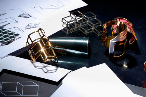 1. สีปัดแก้ม แรงร้อน เจิดจ้า แรงบันดาลใจจากทั้งรองเท้าและกำไล พร้อมเพิ่มลวดลายพื้นผิวด้วยลายกราฟฟิกรูปทรงลูกบาศก์ สัญลักษณ์ประจำตัวนักออกแบบแฟชั่น เคลือบทับด้วยชิมเมอร์ทอง