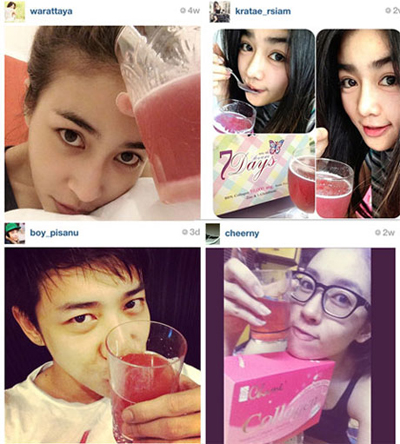กลยุทธ์จับคอลลาเจนมาคู่กับกลูต้าไธโอน (Glutathione) เพื่อดึงดูดผู้บริโภคที่อยากเด้ง เต่งตึง ขาวใสเท่านั้นไม่พอ ยังโฆษณาขึ้นชื่อส่วนผสมอื่นๆ ที่ช่างดูดีขลังเว่อร์ เช่น Glycine, Peptide, Mixedberry, Calcium เป็นต้น