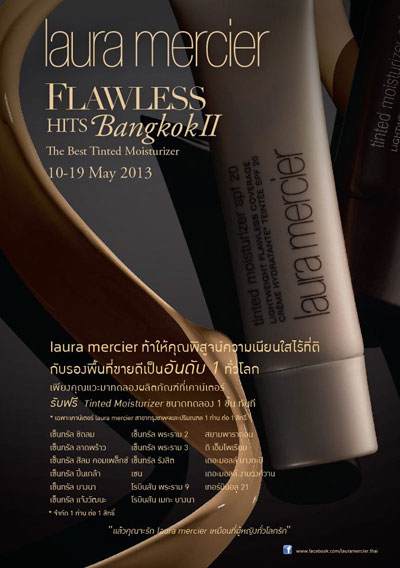 laura mercier ท้าพิสูจน์ความเนียนใสไร้ที่ติ กับรองพื้นที่ขายดีอันดับ 1 ทั่วโลกของ laura mercier กับแคมเปญ Laura Mercier Flawless Hits Bangkok The Best Tinted Moisturizer 10-19 พ.ค.56 นี้ เพียงแวะมาทดลองผลิตภัณฑ์ Tinted Moisturizer รับฟรี Tinted Moisturizer ขนาดทดลอง 1 ชิ้นฟรีทันที เฉพาะเคาน์เตอร์ laura mercier ในกรุงเทพและปริมณฑล 1 ท่านต่อ 1 สิทธิ์ งานนี้ทางแบรนด์แจกแบบไม่จำกัดจำนวนนะคะ