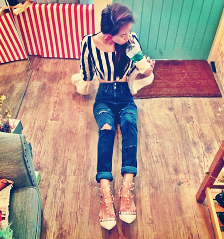 พลอย ชวพร ในยีนส์ขาดเอวสูง กับเสื้อตัวสั้นน่ารักๆ