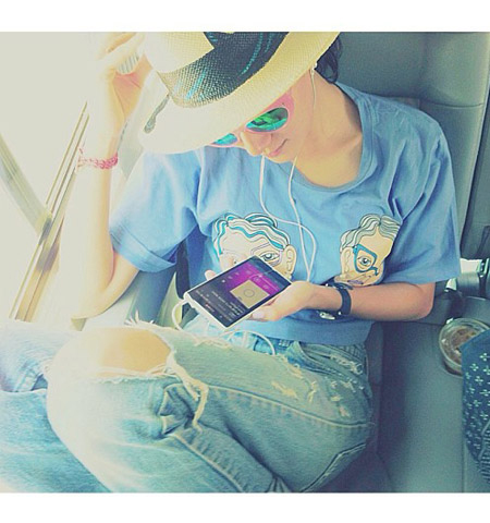 ดา เอ็นโดรฟิน เลือกยีนส์ กับเสื้อแขนกุดลายวงดนตรี เป็นสาวร๊อค ห้าวๆ