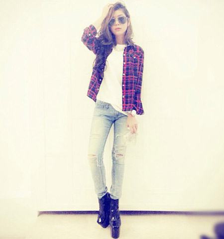 กุ๊บกิ๊บ สุมณทิพย์ สวมยีนส์สกินนี่กับเสื้อยืดสีขาว ทับด้วยเชิ้ตลายสก๊อต ทะมัดทะแมง