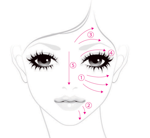 • เริ่มจากการทาบริเวณที่มีพื้นที่มากที่สุดบนใบหน้า นั่นคือ แก้ม โดยทาลักษณะเกลี่ยออก