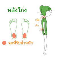 4.หลังแอ่น มีหลายคนที่บริเวณด้านล่างของท้องยื่นออกมาทางด้านหน้า ทำให้หลังแอ่น กระดูกบั้นเอวจะเอียงไปทางด้านหน้าทำให้เอวต้องรับน้ำหนักมาก ส่งผลให้เจ็บบริเวณเอว  5.ขาบิดเข้า ข้อต่อกระดูกของหัวเข่า เอว และข้อต่อสะ 6.ขาโก่ง คือสภาพของช่องว่างระหว่างหัวเข่าวัดได้กว้างกว่าสองนิ้วมือ ส้นเท้าทั้งสองข้างบิดเข้าหากัน และมักจะเกิดอาการเจ็บที่หัวเข่า