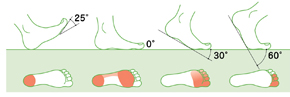 ก่อนอื่นต้องเริ่มจาก ส้นเท้าแตะพื้นก่อน ตามด้วยฝ่าเท้า และเมื่อยกส้นเท้าขึ้น พยายามบังคับให้นิ้วเท้าสัมผัสพื้นทั้ง 5 นิ้ว เมื่อนิ้วเท้าสัมผัสพื้น จะเกิดการถ่ายเทน้ำหนัก จากนิ้วก้อย ไปสู่นิ้วโป้งเท้า จากภาพจะเห็นว่าหลังจากส้นเท้าสัมผัสพื้น น้ำหนักจะถ่ายเทจากด้านนอก (ด้านนิ้วก้อย) ไปสู่นิ้วโป้งเท้า ซึ่งเป็นท่าเดินที่ควรจะเป็น