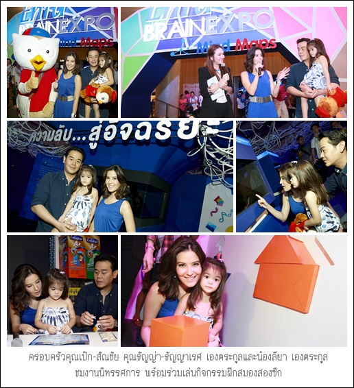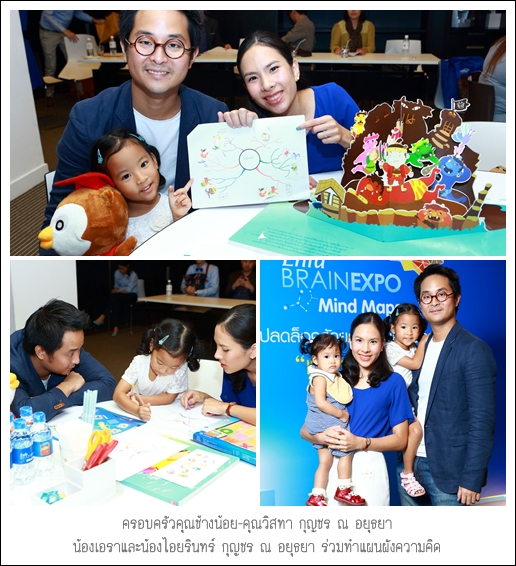 นอกจากนี้ ภายในงานฯ ยังมี ครอบครัวเซเลบริตี้ชื่อดัง คุณช้างน้อย กุญชร ณ อยุธยา พร้อมด้วยภรรยาคนสวย คุณวิสทา น้องเอรา และน้องไอยรินทร์ และครอบครัวสุขสันต์ของคุณเป๊ก-สัณชัย คุณธัญญ่า-ธัญญาเรศ และน้องลียา เองตระกูล มาร่วมแบ่งปันประสบการณ์จริงของการเลี้ยงลูกและร่วมกิจกรรม คุณช้างน้อย กุญชร ณ อยุธยา เผยว่า ครอบครัวของเราให้ความสำคัญกับเรื่องพัฒนาการทางสมองของลูก เพราะเราอยากเห็นลูกเติบโตอย่างมีคุณภาพ ดังนั้น ครอบครัวของเราก็จะสรรหาเทคนิคต่างๆ นำมาประยุกต์ใช้ในการเลี้ยงลูก และเทคนิคแผนผังความคิด Mind Maps ก็เป็นเทคนิคที่ครอบครัวเราได้นำมาใช้เพื่อให้ลูกเข้าใจเรื่องราวต่างๆ ได้ดียิ่งขึ้น นอกจากนี้ เราก็ยังให้ความสำคัญด้านโภชนาการเช่นกัน เพราะเป็นส่วนหนึ่งที่ช่วยเสริมสร้างพัฒนาการทางสมองได้ โดยเราจะเลือกอาหารที่มีประโยชน์กับลูก เช่น การรับประทานปลาทะเลน้ำลึกเพราะมีกรดไขมันดีเอชเอที่จำเป็นต่อร่างกาย และเป็นโครงสร้างพื้นฐานของเซลล์สมอง หรือการเลือกดื่มนมที่มีดีเอชเอสูง ในขณะที่คุณแม่ธัญญ่า-ธัญญาเรศ เองตระกูล เผยว่า จากที่มาร่วมกิจกรรมในวันนี้ ได้รับความรู้เรื่องพัฒนาการทางสมองเพิ่มมากขึ้น เพราะโดยปกติ เราให้ความสำคัญกับเรื่องพัฒนาการทางสมองของน้องลียาอยู่แล้ว โดยเฉพาะในช่วง 3 ปีแรก เราจะเน้นให้เค้าได้ทำกิจกรรมที่หลากหลายเพื่อฝึกการใช้สมองทั้งสองซีก ไม่ว่าจะเป็นการเล่นบล็อกไม้ การวาดภาพ ส่วนตัวคิดว่าแผนผังความคิด Mind Maps ก็เป็นอีกหนึ่งเทคนิคที่เราสามารถนำมาประยุกต์ใช้เพื่อกระตุ้นการเรียนรู้ของลูกได้อย่างมีประสิทธิภาพ