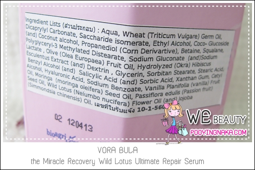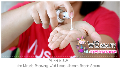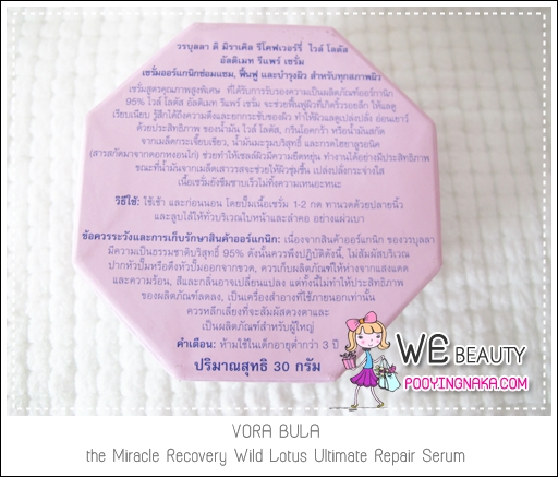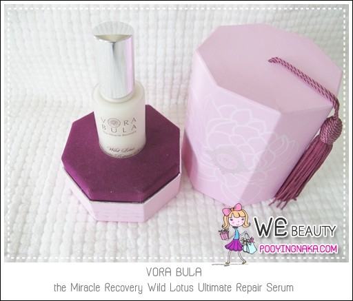 สุดท้ายก็เป็นเซรั่มค่ะ เค้าเคลมว่าเซรั่มตัวนี้เปรียบเสมือนโบท๊อกซ์เลยทีเดียว แต่เป็นโบท๊อกซ์ที่มาจากพืช เก๋นะคะ VORA BULA the Miracle Recovery Wild Lotus Ultimate Repair Serum มาในกล่องสวยงามมากค่ะ พร้อมกับพู่ห้อยมาด้วย กล่องของผลิตภัณฑ์ใช้วัสดุรีไซเคิลนะคะ แล้วให้ชาวบ้านเป็นผู้ผลิตให้ค่ะ