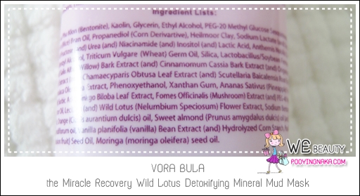 หลังล้างหน้าเสร็จแล้วก็มาส์กหน้ากันสักหน่อยค่ะ VORA BULA เค้ามีมาส์กโคลนด้วยค่ะ VORA BULA the Miracle Recovery Wild Lotus Detoxifying Mineral Mud Mask โดยใช้ภูโคลนที่แม่ฮ่องสอน เพราะเป็นโคลนที่มีแร่ธาตุหายากของโลก มาส์กโคลนจะช่วยดูดซับสิ่งสกปรกที่ตกค้างบนผิวหน้า ช่วยบำรุงผิว แล้วเค้ามีส่วนผสมของ ไวล์ โลตัส น้ำมันจากเมล็ดเสาวรส และน้ำมันมะรุมบริสุทธิ์ ผสานกับสารสกัดจากเปลือกไม้และรากไม้ธรรมชาติที่ช่วยดูดซับความมันและสิ่งตกค้าง ช่วยผลัดเซลล์ผิวใหม่ ทำให้ผิวแลดูกระจ่าง สดใสและอ่อนเยาว์ (จากเอกสารประกอบค่ะ)