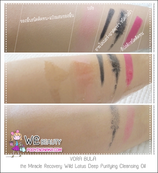 ทดลองให้ดูที่ท้องแขน หยดออยล์ลงไป ไหลหยดเร็วมาก ไม่หนืด เช็ดรอบเดียว ออกแล้ว เช็ดต่ออีกนิดก็ออกหมด ยกเว้นลิปสติกที่ติดทนสุดๆ อะไรก็เอาออกยาก ก็ถือว่า ออยล์ตัวนี้ล้างได้สะอาดนะคะ