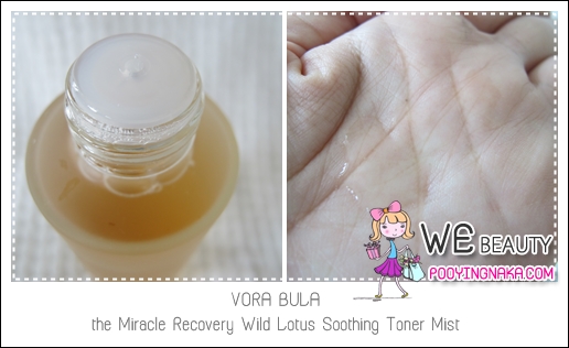 หลังล้างหน้าเสร็จ มาส์กเสร็จ มาใช้โทนเนอร์กันดีกว่าค่ะ  VORA BULA the Miracle Recovery Wild Lotus Soothing Toner Mist เค้าบอกว่า ด้วยความที่ผลิตภัณฑ์เป็นออร์แกนิค ต้องเลี่ยงที่จะสัมผัสโดนบริเวณจุกหรือฝาและห้ามดมผลิตภัณฑ์ด้วยอ่ะ วิธีใช้ก็ให้หยดลงบนฝ่ามือ แล้วค่อยๆแตะบนใบหน้าอย่างเบามือนะคะ