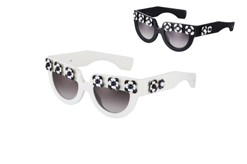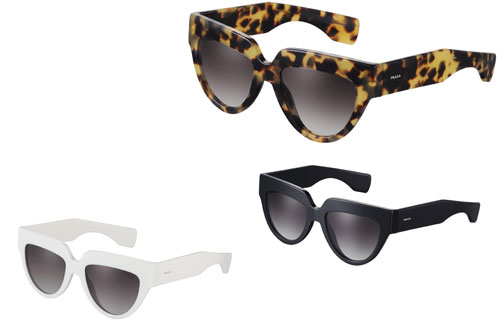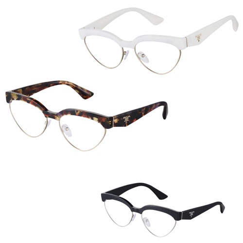 รูปทรงที่แปลกตาคือคุณลักษณะเด่นของแว่นตารุ่นนี้ที่ได้รับแรงบันดาลใจจากยุค 1950s แว่นตาทรง ตาแมวที่ทำาจากโลหะซิลซึ่งมีความแตกต่างด้วยลายเส้นแบบต้นฉบับและวัสดุผสมอะซิเตทในสีดำาสีงาช้าง ลายกระสีโกโก้และม่วง ลายกระสีทราย-สีน้ำาตาลเข้ม และส่วนที่เป็นโลหะมีสีทองซีด และสี ตะกั่ว มีโลโกตัวอักษรของ Prada ประดับบนขาแว่นทรงสามเหลี่ยม
