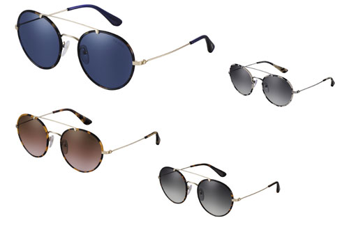 Prada ได้นำาเสนอแว่นตาทรงกลมคลาสสิกให้มีลุคที่ทันสมัยมากขึ้น ใช้วัสดุอะซิเตทเคลือบขอบโลหะ และดีไซน์ให้ดูดีขึ้นด้วยการใช้ขาเชื่อมแว่นคู่ทรงโค้งยึดกับขอบ เปลือย ส่วนที่หุ้มอยู่ในวัสดุอะซิเตทมีสีดังต่อไปนี้ สีดำาลายกระ ลายกระสีกลาง ลายกระสีทราย-สี