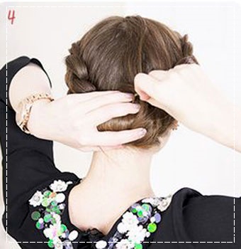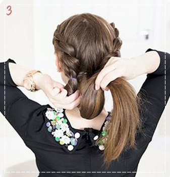 3. หลังจากนั้นให้ทำการสอดหางผมที่เหลือจากการถักเปียเข้าไปตรงกลางท้ายทอยที่เรามัดผมไว้  (หากผมยาวมากๆให้สอดเข้าทั้งหมด 2 ครั้งค่ะ)