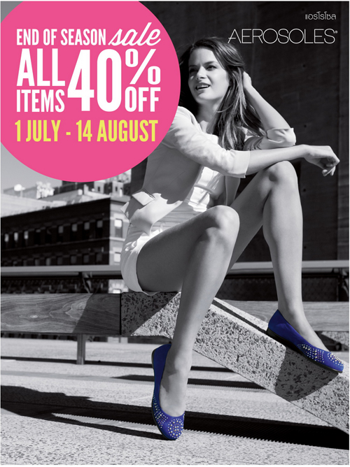 แอร์โรโซล (AEROSOLES) รองเท้าเพื่อสุขภาพจากอเมริกา ด้วยเทคโนโลยีพื้นลายเพชรมีความยืดหยุ่นสูง สามารถพับงอได้โดยไม่เสียรูปทรง รองรับแรงกระแทกในการเดินได้เป็นอย่างดี  และระบบเมมโมรี่โฟมที่พื้นรองเท้า  ให้สัมผัสนุ่มสบายในการสวมใส่และดูดีอย่างมีสไตล์  ขอมอบความสุขให้ขาช๊อปเลือกช๊อปจุใจกับรองเท้าทุกแบบทุกสไตล์ ด้วยโปรโมชั่นพิเศษกับเทศกาล “END OF SEASON SALE” ลดสูงสุดถึง 40 เปอร์เซ็นต์  ที่ร้านแอร์โรโซลและเคาน์เตอร์แอร์โรโซลทุกสาขาที่ร่วมรายการ ตั้งแต่วันนี้ ถึง 14 สิงหาคม 2556