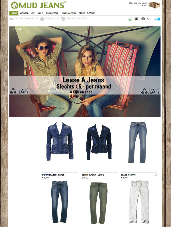 Bert van Son เจ้าของธุรกิจเสื้อผ้า MUD JEANS ประเทศเนเธอร์แลนด์ ได้ปรับแนวคิด "เช่าเสื้อผ้า ลดปัญหาขยะโลก" จากโมเดลง่ายๆทั่วไป กับสินค้าที่มีสภาพคงทน เช่น รถยนต์หรือเสื้อผ้าตลาดบนที่ผู้คนนิยมเช่ามากกว่าซื้อ เมื่อมองในภาพรวม หากสามารถทำให้ผู้บริโภคลดความเป็นเจ้าของ ก็จะลดปริมาณการผลิตใหม่ และใช้ทรัพยากรย์ลดลงได้อย่างมาก โดยเลือกใช้โมเดล "เช่า" เป็นทางเลือกฉลาดๆ ที่ใช้กับเสื้อผ้า "ยีนส์" เพราะยีนส์ใหม่ไหนจะเก๋าเท่ายีนส์เก่า โดย MUD JEANS มีระเบียบการเช่าง่ายๆ คือ มีค่าแรกเข้าราคา 20 ยูโร (หรือประมาณ 800-900 บาท) เพื่อเป็นค่าสมาชิกและจัดส่งเสื้อผ้าครั้งแรก และมีค่าธรรมเนียมรายเดือนละ 5 ยูโร เมื่อผู้บริโภคเช่าครบ 1 ปีจะมีทางเลือกเพิ่มคือ ส่งคืนถาวร, เปลี่ยนตัวใหม่ หรือชอบใจจะเก็บไว้ใส่ต่อ โดยมีค่าบริการเพิ่มในแต่ละส่วนตามลำดับ