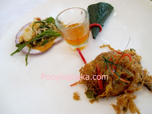 อาหารว่าง ยำยอดกระถินใบบัวบกใส่หอยเซลล์ ห่อหมกปูทอด เมี่ยงไก่บ้านกับสมุนไพร
