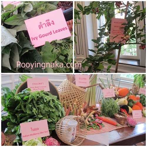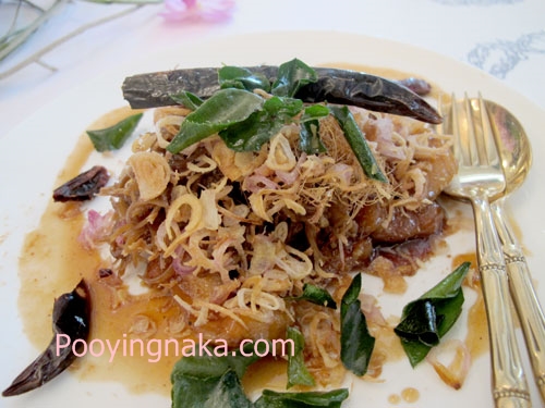 อาหารจานหลัก กุ้งลายเสือผัดสะตอใส่ใบยี่หร่า แกงเนื้อย่างใบยอ (หรือหมูจินหัวย่าง) ปลาช่อนแม่น้ำแม่ลาทอดกรอบราดน้ำปลาหวานสมุนไพร