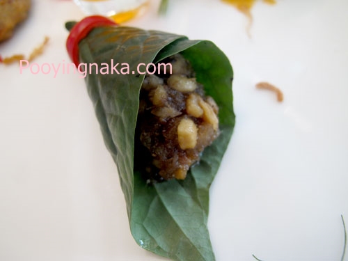 เมี่ยงไก่บ้าน กับสมุนไพร รสชาติ ออกหวานเมื่อทานร่วมกับใบชะพลูที่ห่อมาด้วย รสชาติก็จะอร่อยลงตัวยิ่งขึ้นค่ะ