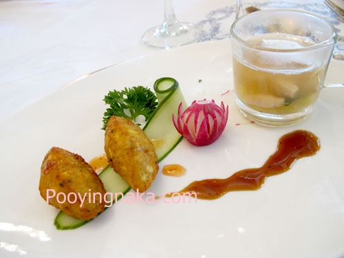 อาหารเรียกน้ำย่อย เมนูแรก บาเยียถั่วทองกลิ่นยี่หร่า และ ต้มจิ๋วน้ำใสเนื้อ (หรือ ไก่)