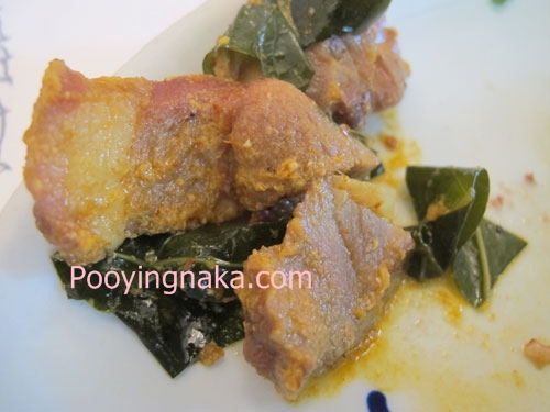 แกงเนื้อย่างใบยอ หรือหมูจินหัวย่าง รสชาติกล่มกล่อมค่ะ หอมรสพริกแกง เมื่อทานเนื้อหมูพร้อมกับใบยอแล้วรสชาติจะดีกว่าทานหมูเพรียวๆ ค่ะ ช่วยซอฟรสชาติไม่ให้เผ็ดมากจนเกินไป