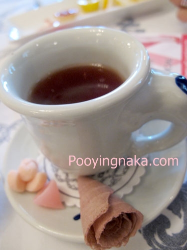 ชากลิ่นอบเอย เมื่อทานเข้าไปแล้วหอมกลิ่นอบเชยมากๆ เลยค่ะ และเสิร์ฟคู่กับขนมไทย คืออาลัว ทองม้วนและกลีบลำดวลค่ะ