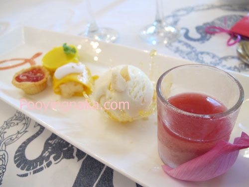 อาหารหวาน พุดดิ้งมะม่วงน้ำดอกไม้ ข้าวเหนียวมะม่วง กับไอศครีมวนิลาแมคคาเมีย ทีเด็ดคือเสิร์ฟคู่กับคอมโพทมะม่วงหาวมะนาวโห่ ตัวนี้ทานเข้าไปแล้วถึงกับตื่นเลยค่ะ เพราะมีรสชาติเปรี้ยว มากๆ แต่เมื่อทานคู่กับไอศครีมวนิลาแมคคาเมียแล้วพอดับรสชาติเปรี้ยวลงได้นิดหน่อยค่ะ