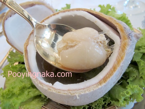 - รสชาติอาหาร ของแกงจืดเงาะนั้น น้ำซุปรสชาติหวาน กลมกล่อมกำลังดี ส่วนตัวเนื้อเงาะ นั้นไม่ใช่เงาะกระป๋องน่ะค่ะ ทางภัตตาคารใช้เงาะสดและคว้านเมล็ดของเงาะออกแล้วน้ำมายัดใส้ด้วยหมูและวุ้นเส้น เมื่อทานเข้าไปแล้วรสชาติดีหวาน มองเผินๆ เหมือนปลาหมึกยัดใส้เลยค่ะ หากพลอยไม่ทราบว่าตัวที่ยัดใส้นั้นเป็นเงาะ ทานเข้าไปจะไม่รสชาติของเงาะอยู่เลยค่ะ แต่อร่อยมากๆ เมนูนี้ ภาชนะที่ใส่มาเป็นภาชนะเป็นลูกมะพร้าวค่ะ