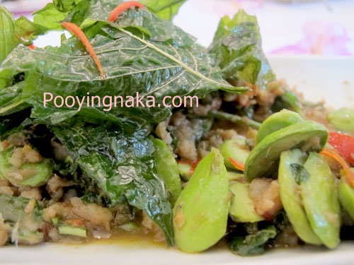 อาหารเคียง คือ ผัดผักเหมียงกุ้งเสียบ จานนี้เมื่อทานแล้วรสชาติกำลังพอดีไม่เผ็ดค่ะ หวานๆ ในขณะเคี้ยวนั้นจะได้กลิ่นใบเมี่ยงหอมๆ ค่ะ