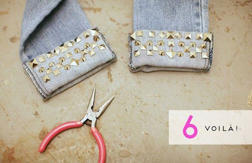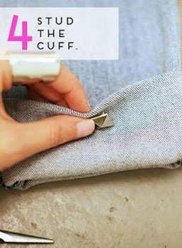 ใช้หมุดเจาะเสื้อเจาะลงไปในเนื้อผ้ากางเกงยีนส์ของเราตามตำแหน่งที่เราต้องการเลยคะ ทำต่อให้ครบทั้ง 2 ข้างเลยคะ และให้ใช้ครีมหนีบช่วยกดตรงหมุดข้างหลังให้ยึดกับกางเกงของเราให้แน่นคะ