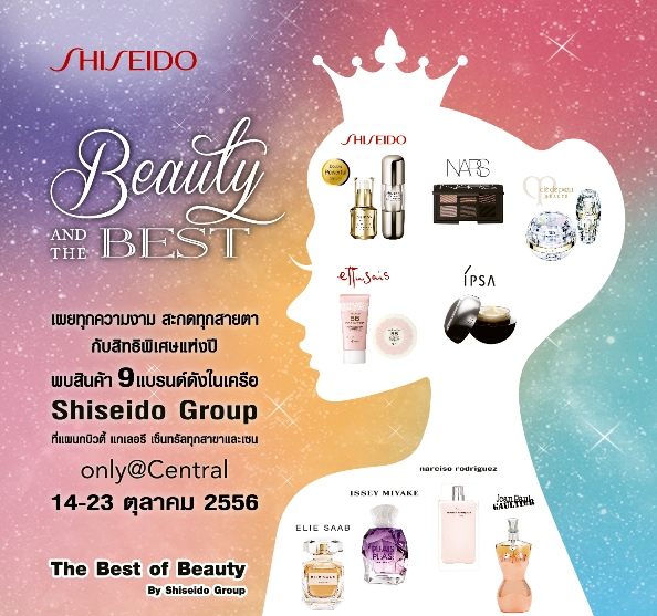 บริษัท ชิเซโด้ (ไทยแลนด์) จำกัด จัดงานThe Best of Beauty by Shiseido Group ขนกองทัพผลิตภัณฑ์บำรุงผิว เมคอัพและน้ำหอมจาก 9 แบรนด์ดังระดับไฮเอนด์ในเครือชิเซโด้ ไม่ว่าจะเป็น Shiseido(ชิเซโด้), NARS(นาร์ส), Cle de Peau Beaute (เคลย์ เดอ โป โบเต้), IPSA(อิปซ่า), Ettusais (เอต์ตูเซ่ส์), Jean Paul Gautier(ฌอง ปอล โกลติเยร์) , Issey Miyake (อิซเซ่ มิยาเกะ) Narciso Rodriguez (นาร์ซิโซ โรดริเกวซ) และ ELIE SAAB (เอลี ซาบ) มามอบข้อเสนอ และโปรโมชั่นสุดพิเศษ ลดและรับถึง 6 ต่อ!