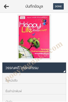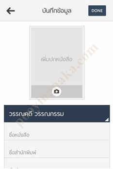 เลือกบันทึกข้อมูลหนังสือที่เราต้องการอ่านคะ เราสามารถถ่ายรูปปกหนังสือที่เราจะอ่านและอย่าลืมกรอกข้อมูลของหนังสือที่อ่านลงไปด้วยนะคะ ซึ่งข้อมูลก็จะมี ประเภทของหนังสือ ชื่อสำนักพิมพ์ ชื่อหนังสือ ผู้แต่ง ผู้แปล(ถ้ามี) สำนักพิมพ์คะ