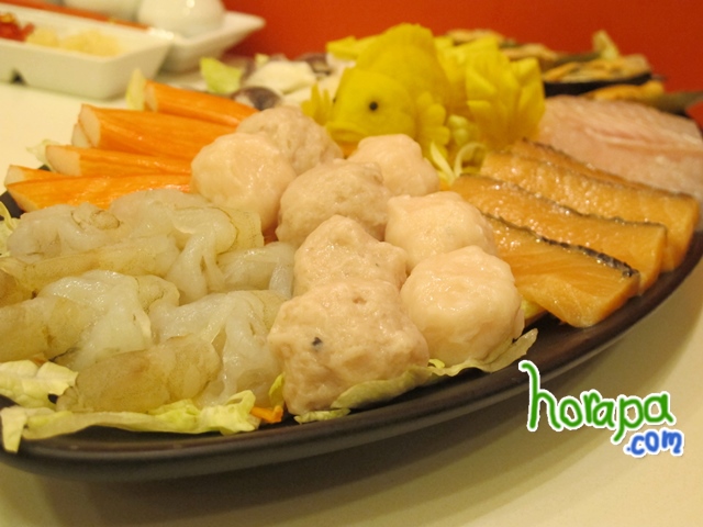 จุดเด่นอีกอย่างหนึ่งที่เชฟแนะนำก็คือลูกชิ้นปลาหมึกค่ะ เป็นลูกชิ้นที่ทางร้านทำเองด้วย จะหนึบๆหน่อยเมื่อสุกแล้วค่ะ นอกจากนี้ก็จะมีซีฟู้ดต่างๆ หอยแมลงภู่นิวซีแลนด์ก็ตัวโตดีค่ะ