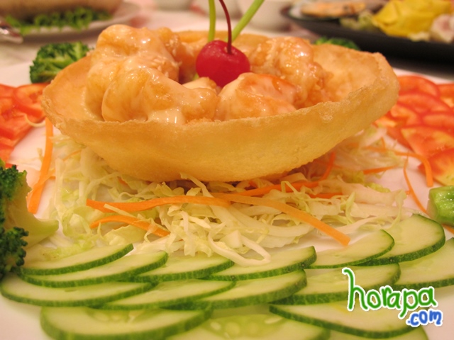 สลัดกุ้งทอดราดซอสมายองเนส ชามเป็นแป้งทอดกรอบค่ะ ทานได้ (ปกติไม่ค่อยทานอะไรแบบนี้นะคะ ไม่ชอบอะไรที่เป็นมายองเนส แต่เพราะทีมงานชิมไม่ได้เลยต้องชิม) อร่อยมาก ตัวซอสจะหวานๆ กุ้งกรอบๆ จากไม่ชอบทานก็ยังรู้สึกว่ามันอร่อยเลยค่ะ