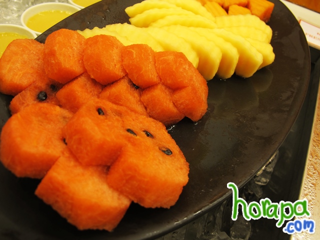 ผลไม้สดจัดจานเอาไว้ เราต้องไปเลือกตักเองค่ะ