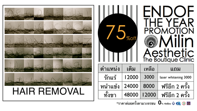HAIR REMOVAL ลด 75%!!!!!!! หนึ่งใน END of The YEAR PROMOTION ทั้งลด ทั้งแถม !!!! ปีนี้ทุกโปรแกรม ลดสูงสุดถึง 75% มีโปรโมชั่นกับบัตรเครดิต KTC กสิกร SCB กรุงเทพ สูงสุด 10 เดือน
