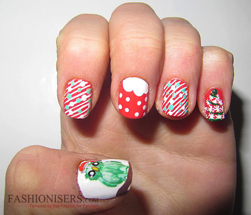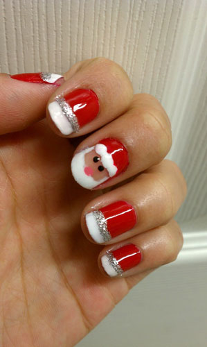 โทนสีที่เน้นในเทศกาลคริสมาสต์นั้นคือ สีแดง สีเขียว และสีขาว เป็นส่วนใหญ่ค่ะ ที่เหลือก็เป็นการดีไซด์เล็บของแต่ละคนแล้วล่ะค่ะ เราสามารถวาดกวางเรนเดีย ซานตาคลอส ขนม และดาวต่างๆ เพ้นส์ลงไปในเล็บของเราได้เลยค่ะ มาดูรูปตัวอย่างกันดีกว่าค่ะ เริ่มที่ ซานตาคลอส ขาดไม่ได้เลยน่ะสำหรับเทศกาลคริสมาสต์เนี่ย