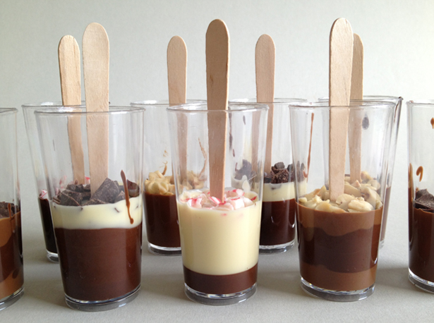ละลายช็อคโกแลตในไมโครเวฟ คนให้ช็อคโกแลตละลายดี แล้วนำมาเทใส่แก้ว หากจะทำหลายชั้นหลายรส ให้ทิ้งระยะแต่ละชั้นประมาณ 5 นาที เมื่อได้ชั้นที่ต้องการแล้วให้เอาช้อนจิ้มลงไปตรงกลางแล้วก็โรยท้อปปิ้งเลยค่ะ