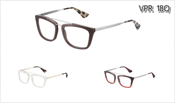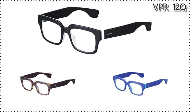แว่นสายตาสไตล์คลาสสิกทรงสี่เหลี่ยมที่มีลายเส้นโค้งมนทำให้มีรูปลักษณ์ที่ดูสะอาดตาและน่า สนใจ ป้ายโลหะบนขาแว่นมีการสลักโลโกตัวอักษรของ Prada ไว้ มีวางจำหน่ายในสีดำ สีดำด้านลายหินอ่อน สีน้ำตาลลายหินอ่อน สีกระอ่อน และสีม่วงอ่อน